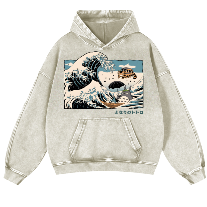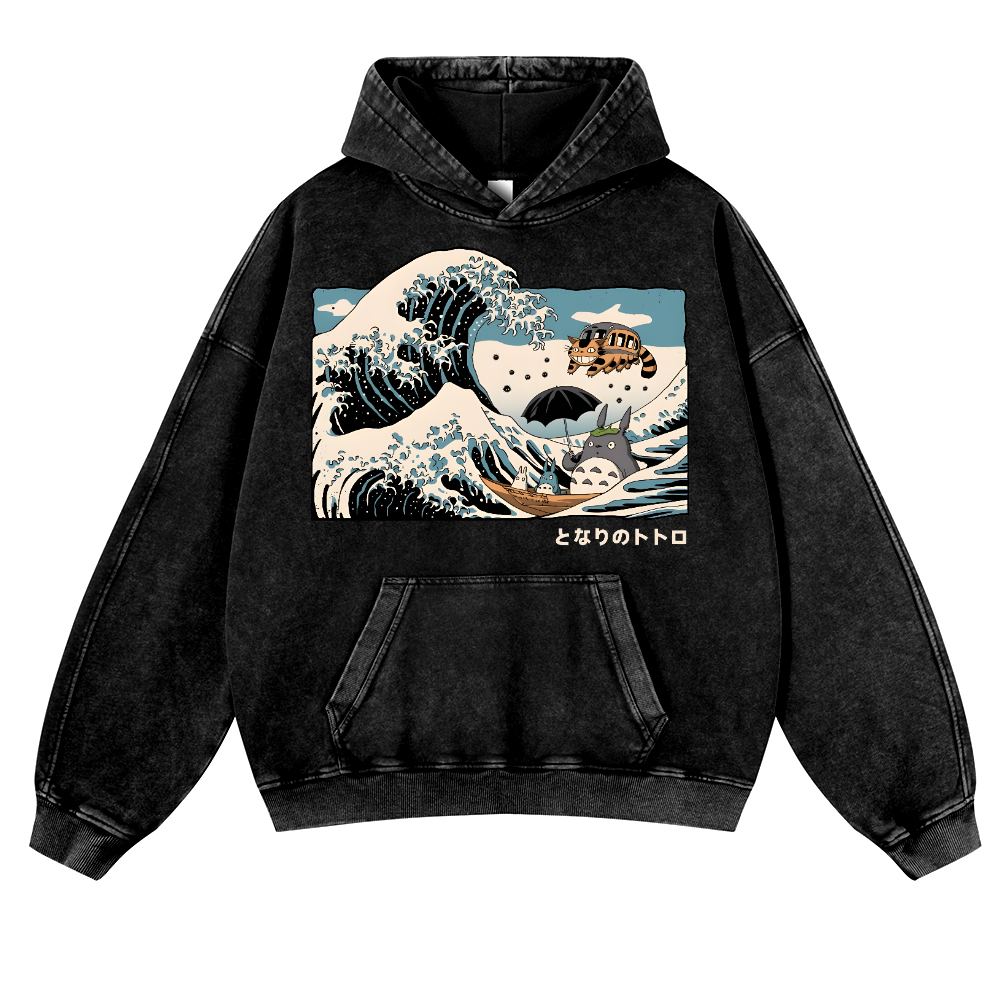 Ghibli Totoro Cat Anime Ukiyoe Wave Vintage Washed Thick Cotton Hoodie