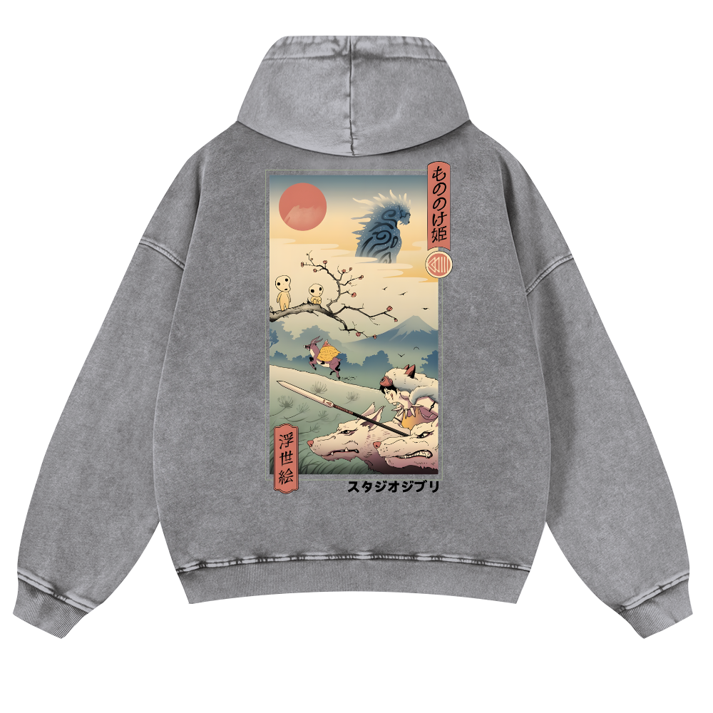 Ghibli Princess Mononoke Anime Ukiyoe Vintage Washed Cotton Back Art Hoodie