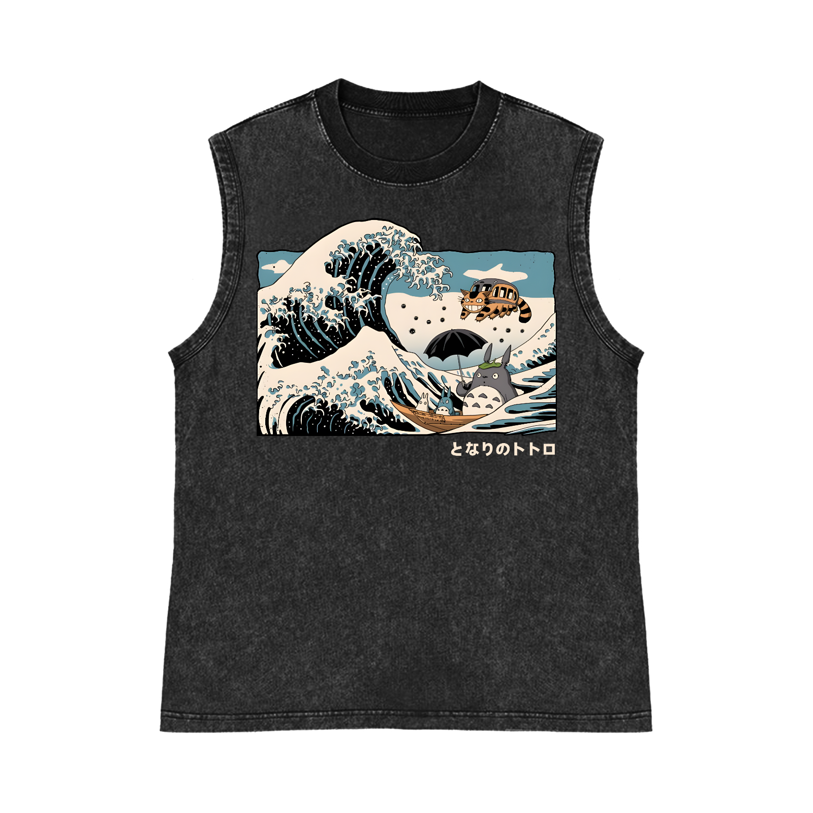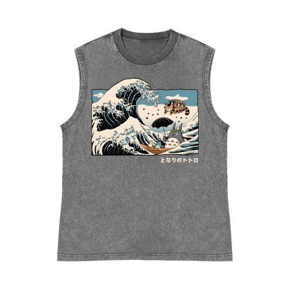 Ghibli Totoro Cat Anime Ukiyoe Wave Pure Cotton Wash-Dyed Sleeveless Tank Top