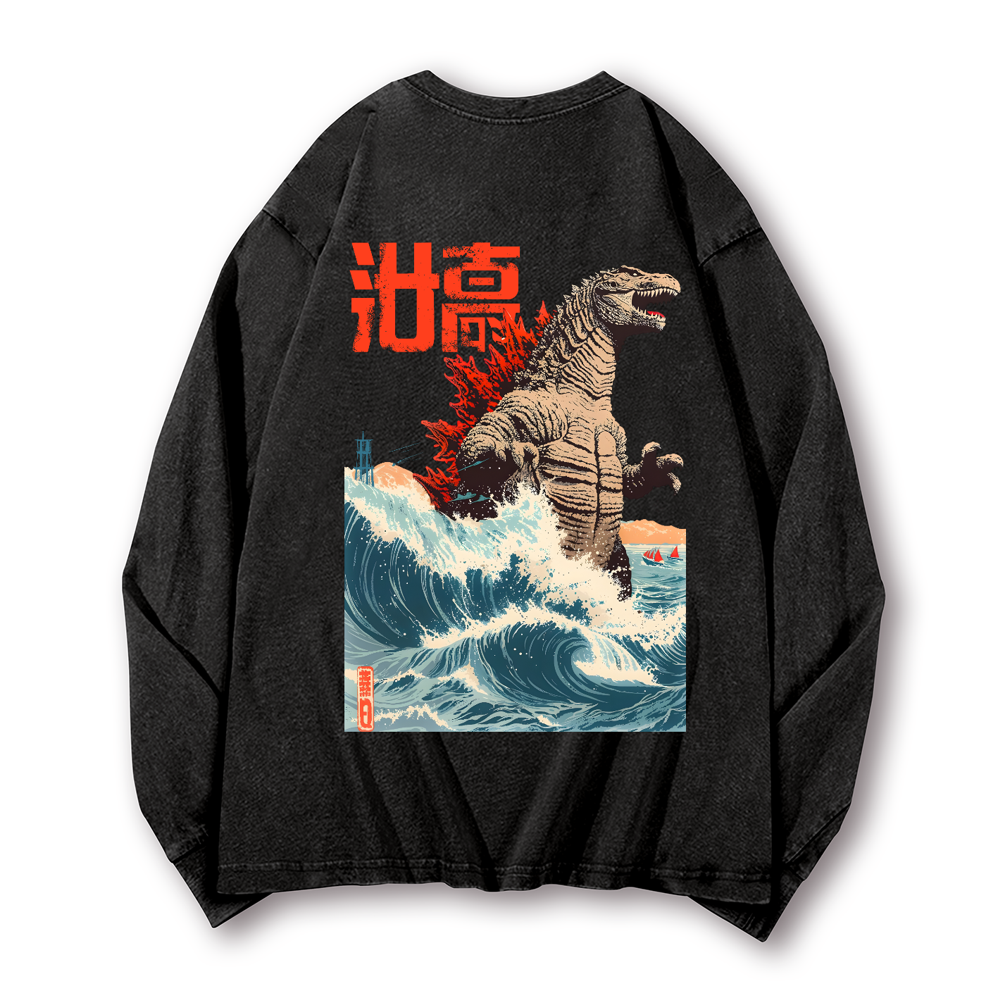 Kaiju Wave Vintage Washed Cotton Back Art Long-sleeve T-shirt