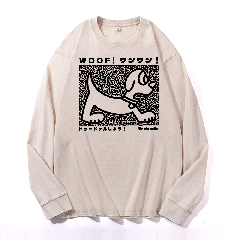 Mr Doodle Dog Woof Vintage Cotton Wash Long-sleeve T-shirt