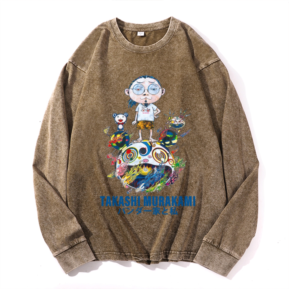 TM Panda Flower Vintage Cotton Wash Crewneck Long-Sleeve T-Shirt