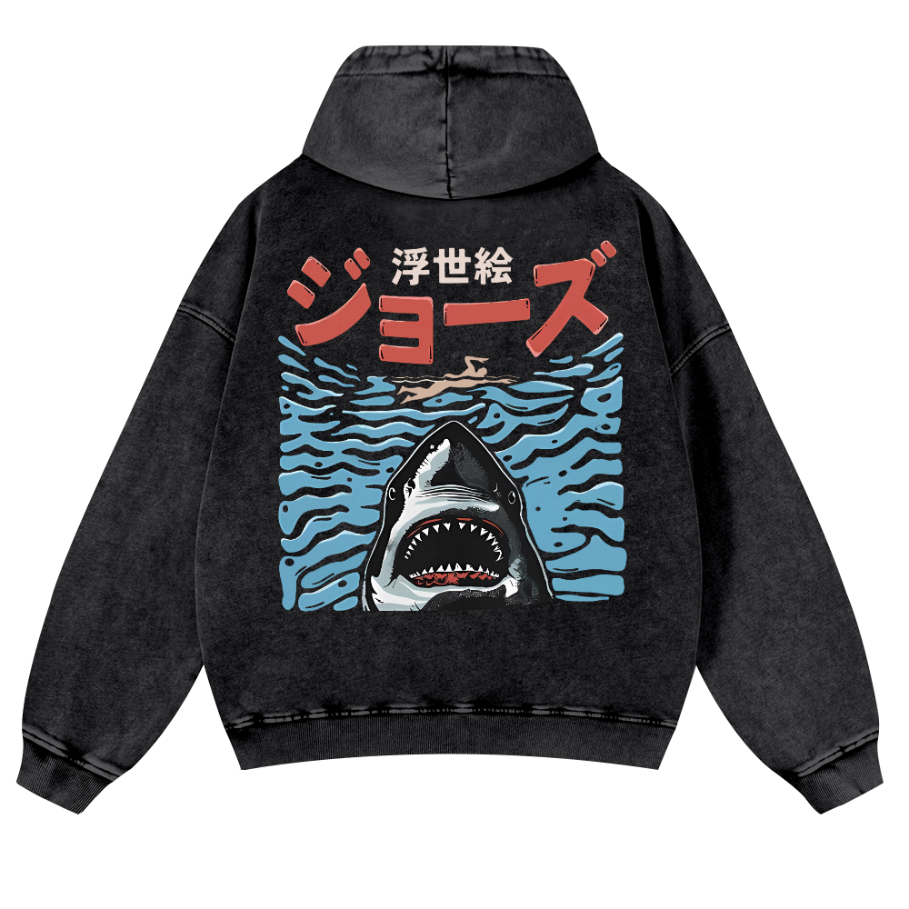 Ukiyoe Jaws Shark Vintage Washed Cotton Back Art Hoodie